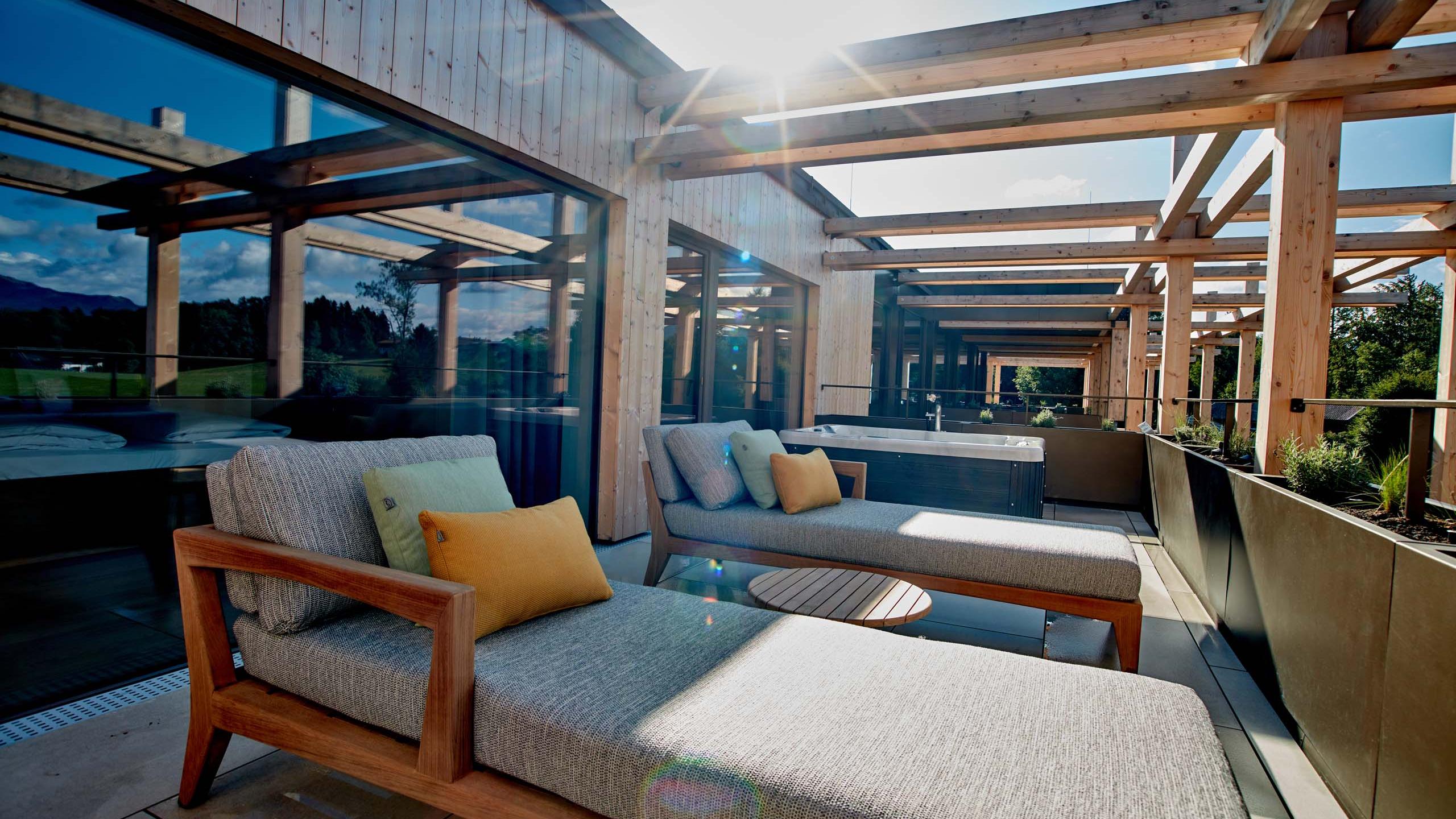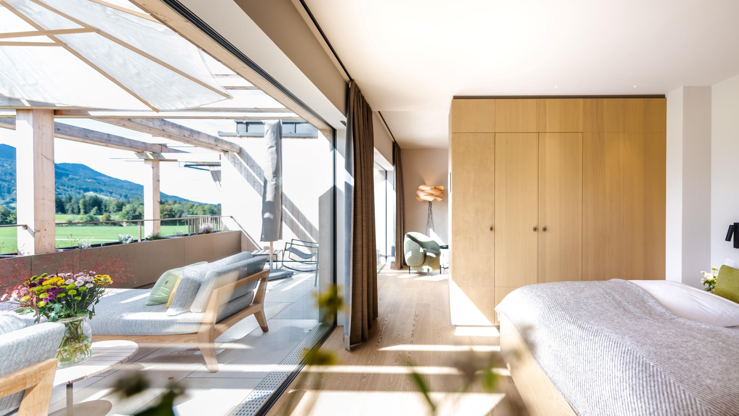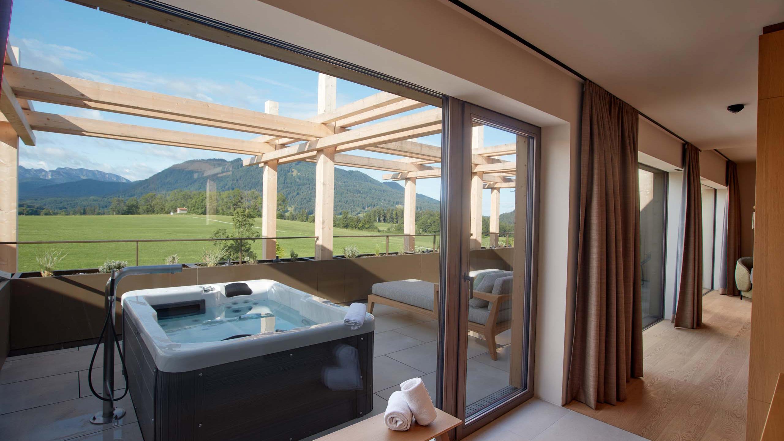 The Berg suite can welcome up to three people and offers them an unforgettable holiday. It’s situated on the top floor and offers stunning views across the mountain world. Look forward to stylish furniture, a modern design bathroom, and floor-to-ceiling panoramic windows with amazing views. The highlight of our Berg suite is a dream 30m2 roof terrace with private whirlpool. A parking space in the garage is included.