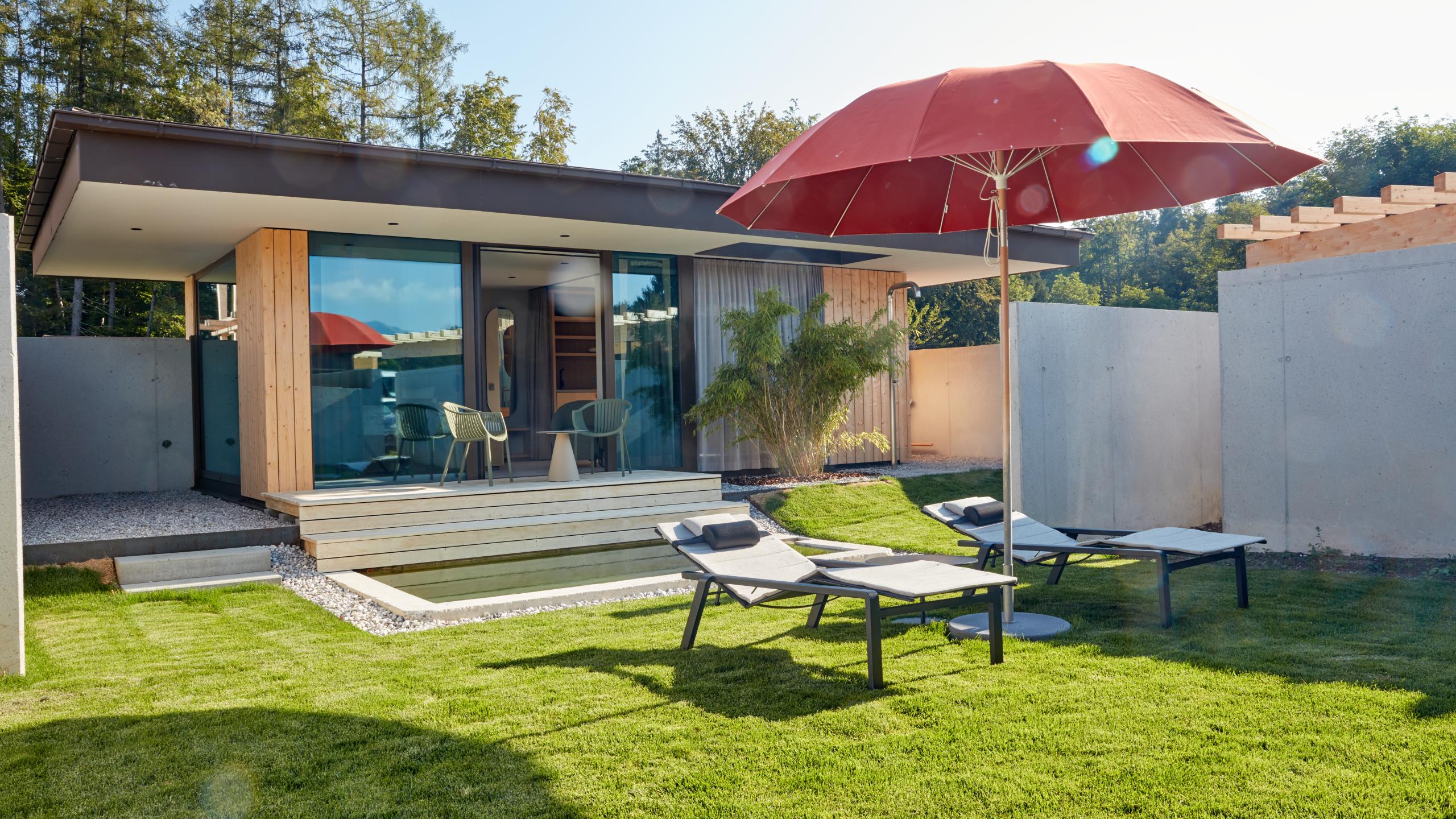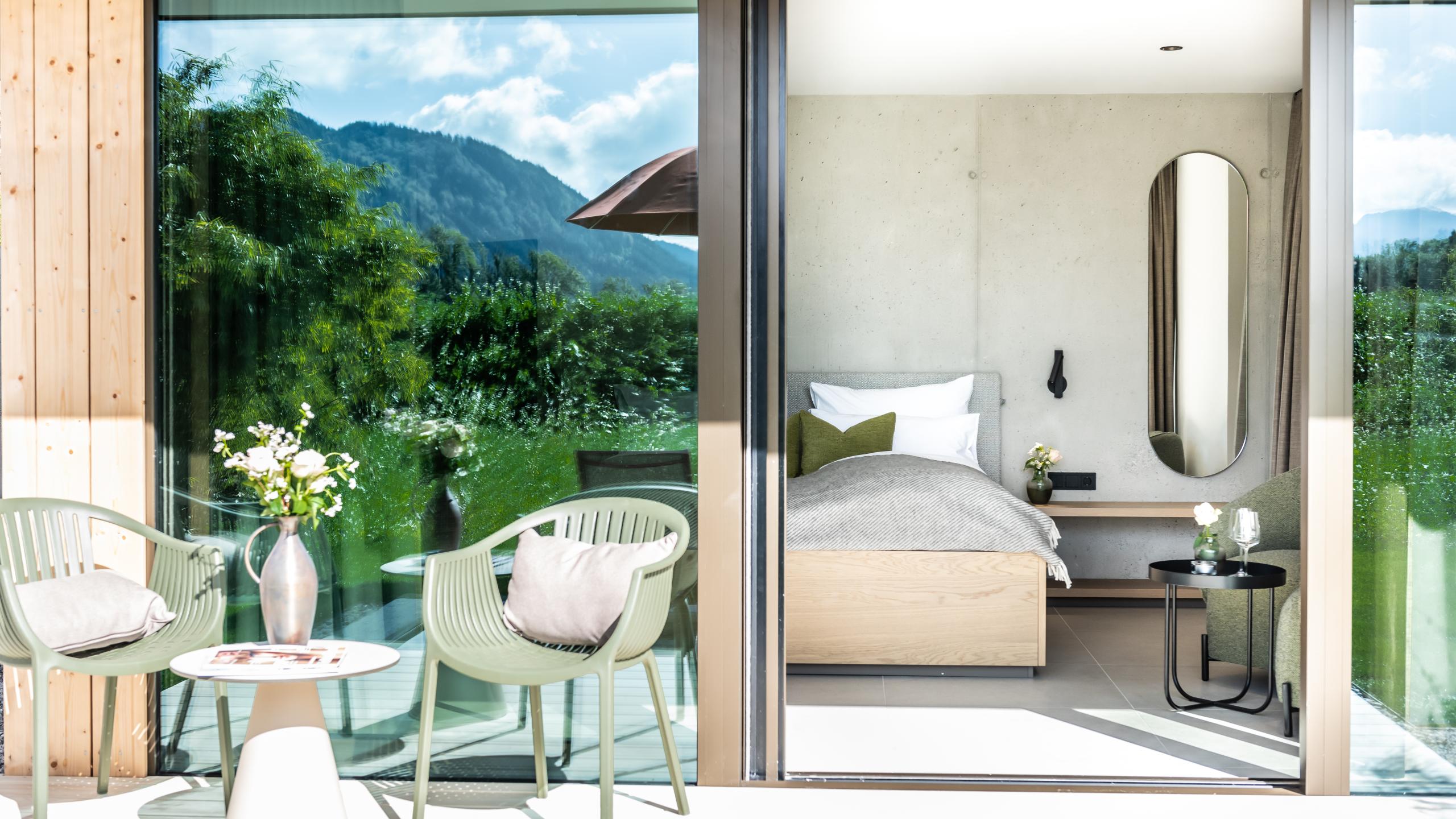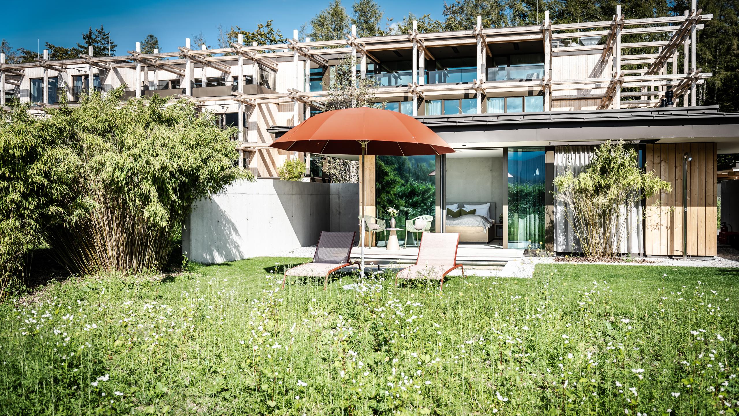 Ein herrlicher Rückzugsort in der Gartenanlage, nur wenige Meter vom Hotel entfernt. In deiner Garten Suite strahlt die Sonne durch die herrlichen Panoramafenster, für viel Licht und Geborgenheit.