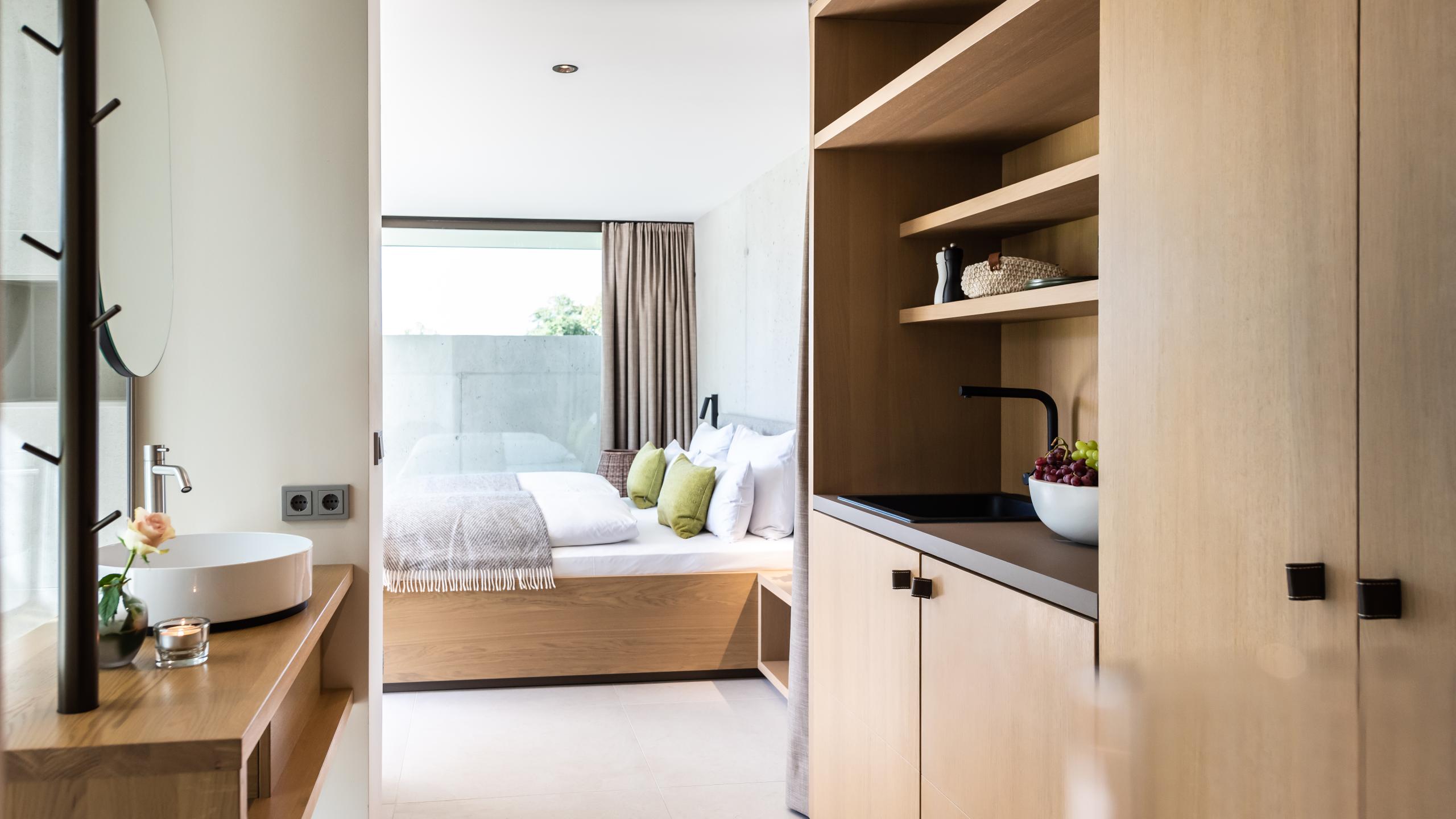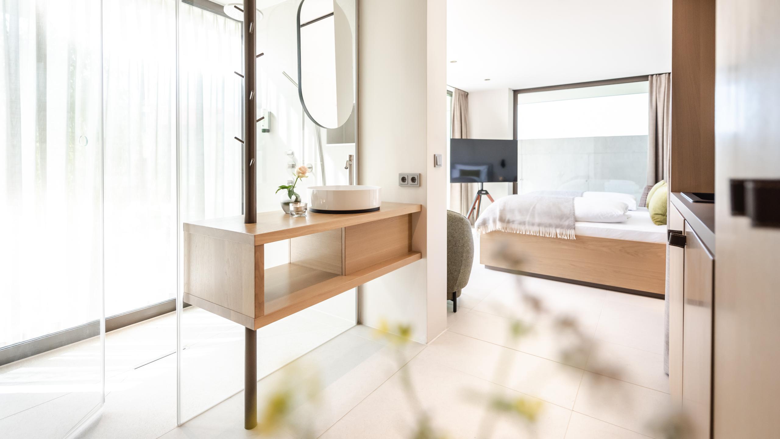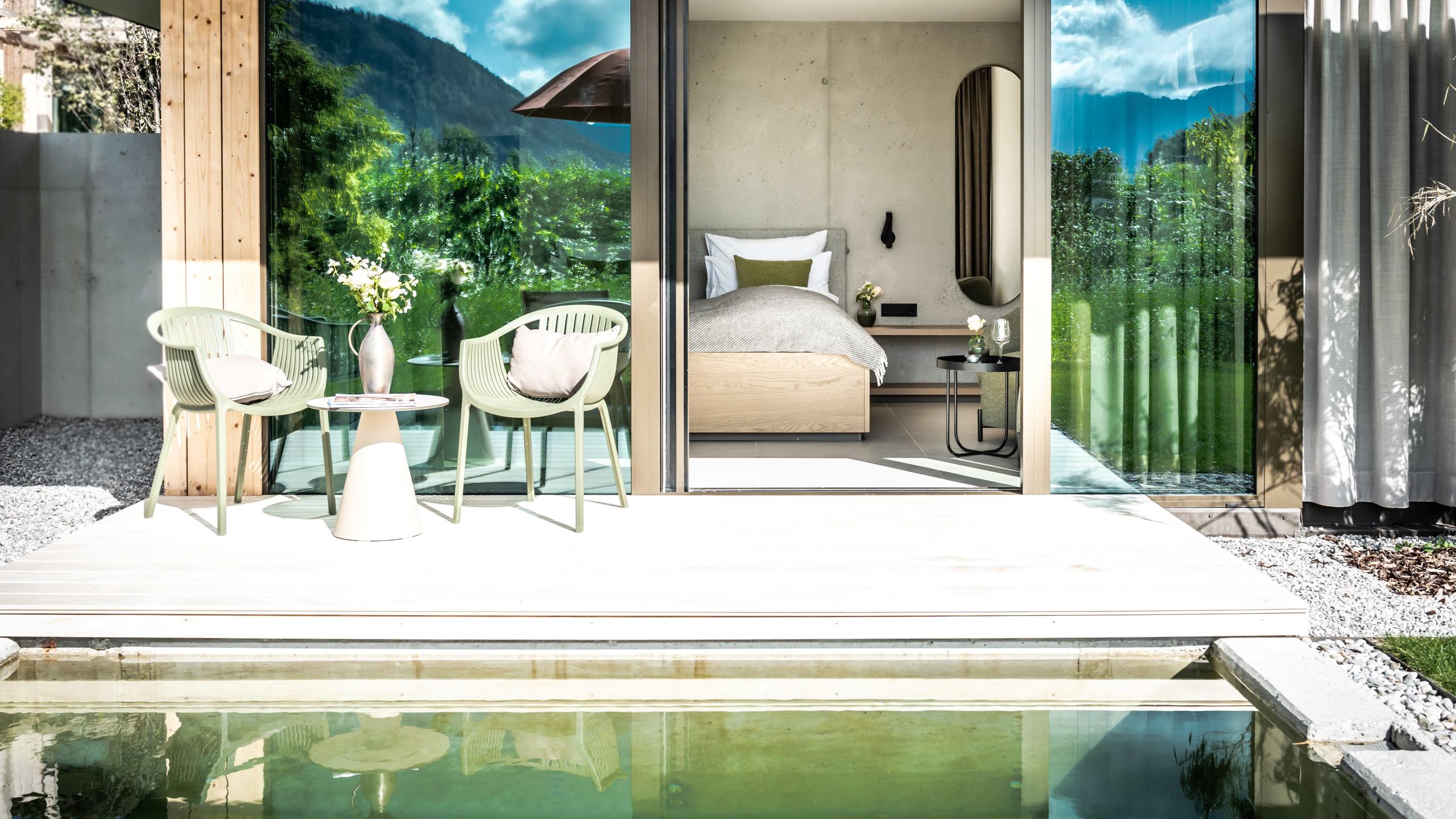 Ein herrlicher Rückzugsort in der Gartenanlage, nur wenige Meter vom Hotel entfernt. In deiner Garten Suite strahlt die Sonne durch die herrlichen Panoramafenster, für viel Licht und Geborgenheit.