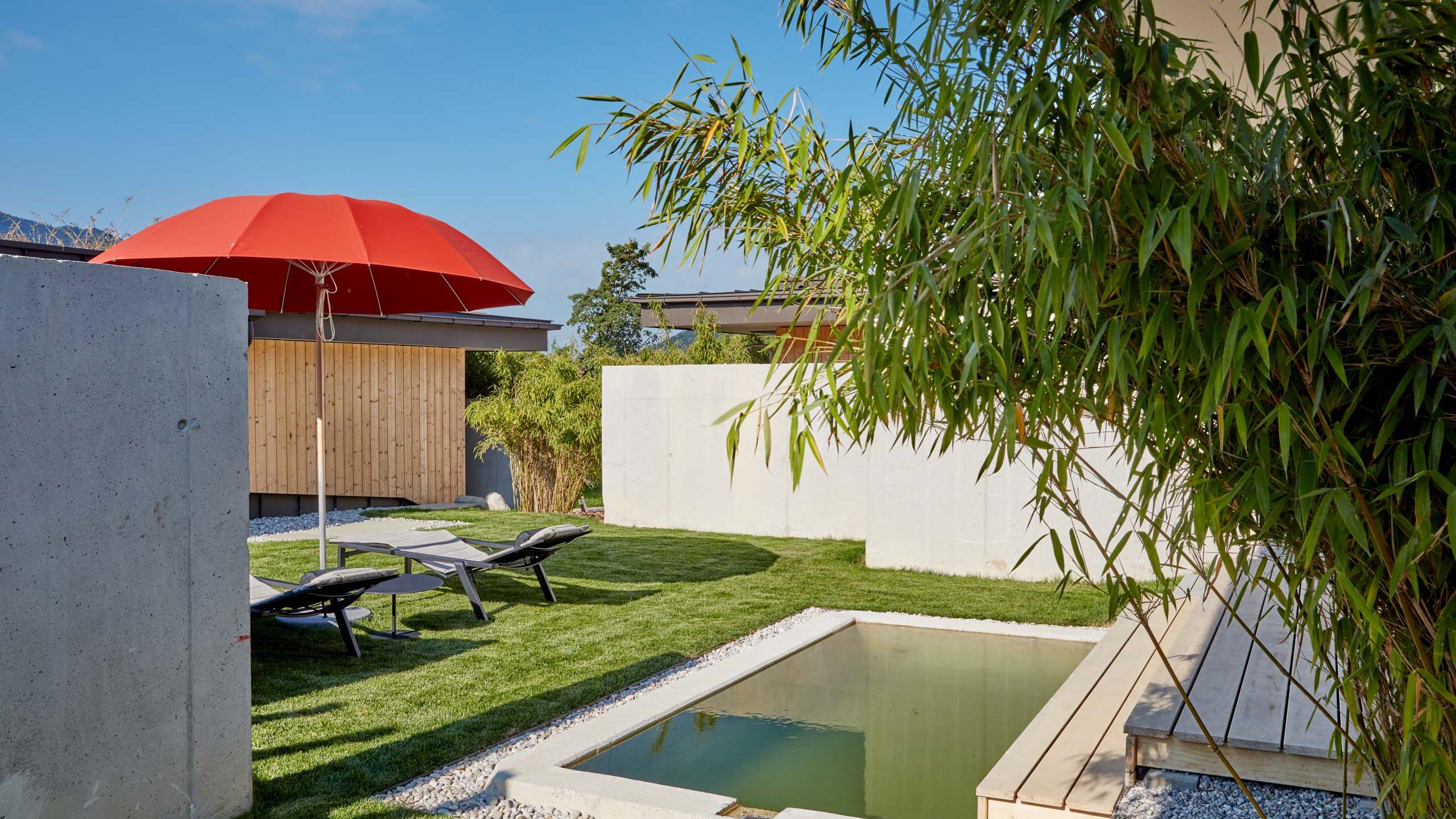 Diese Suite besticht durch den großen privaten Garten mit herrlichem Ausblick auf die Voralpen. Auf deiner Sonnenterrasse verzaubert dich dein eigener kleiner Pool, gefüllt mit GRANDER Wasser, sowie eine spektakuläre Außendusche. Die Suite ist stilvoll eingerichtet mit einem herrlichen Design-Badezimmer mit bodenlangem Panoramafenster, sowie einer Kitchenette mit Kühlschrank und Nespresso-Maschine. Auch ein Teekocher, sowie Tee ist vorhanden. Der große Flatscreen-TV sucht seinesgleichen. Ideal für Hundebesitzer, wegen des direkten Gartenzugangs.